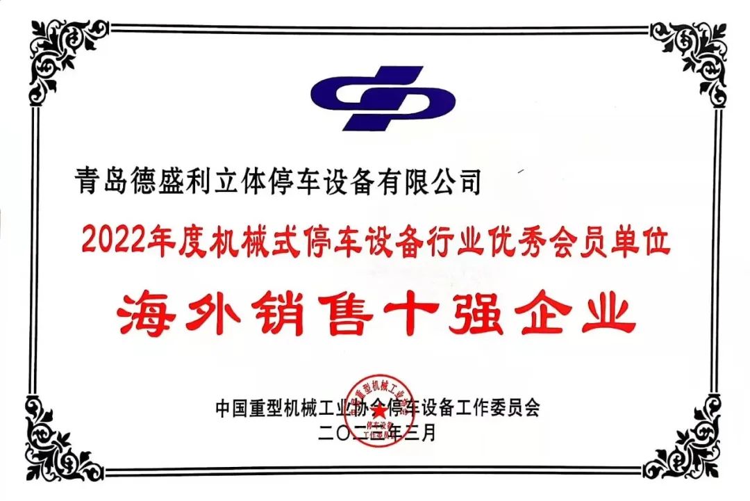 掌握核心技术,推进智慧停车,青岛德盛利凭借一流的产品质量、卓越的创新能力、丰富的项目经验和优秀的市场业绩,获得社会各界的高度认可。公司荣获2022年度机械式停车设备行业十佳企业、2022年度机械式停车设备行业销售三十强企业和2022年度机械式停车设备行业海外销售十强企业,公司董事长杨同德荣获2022年度中国停车行业先进科技工作者科技创新带头人称号,公司总经理管延华荣获2022年度中国停车行业先进科技工作者称号。